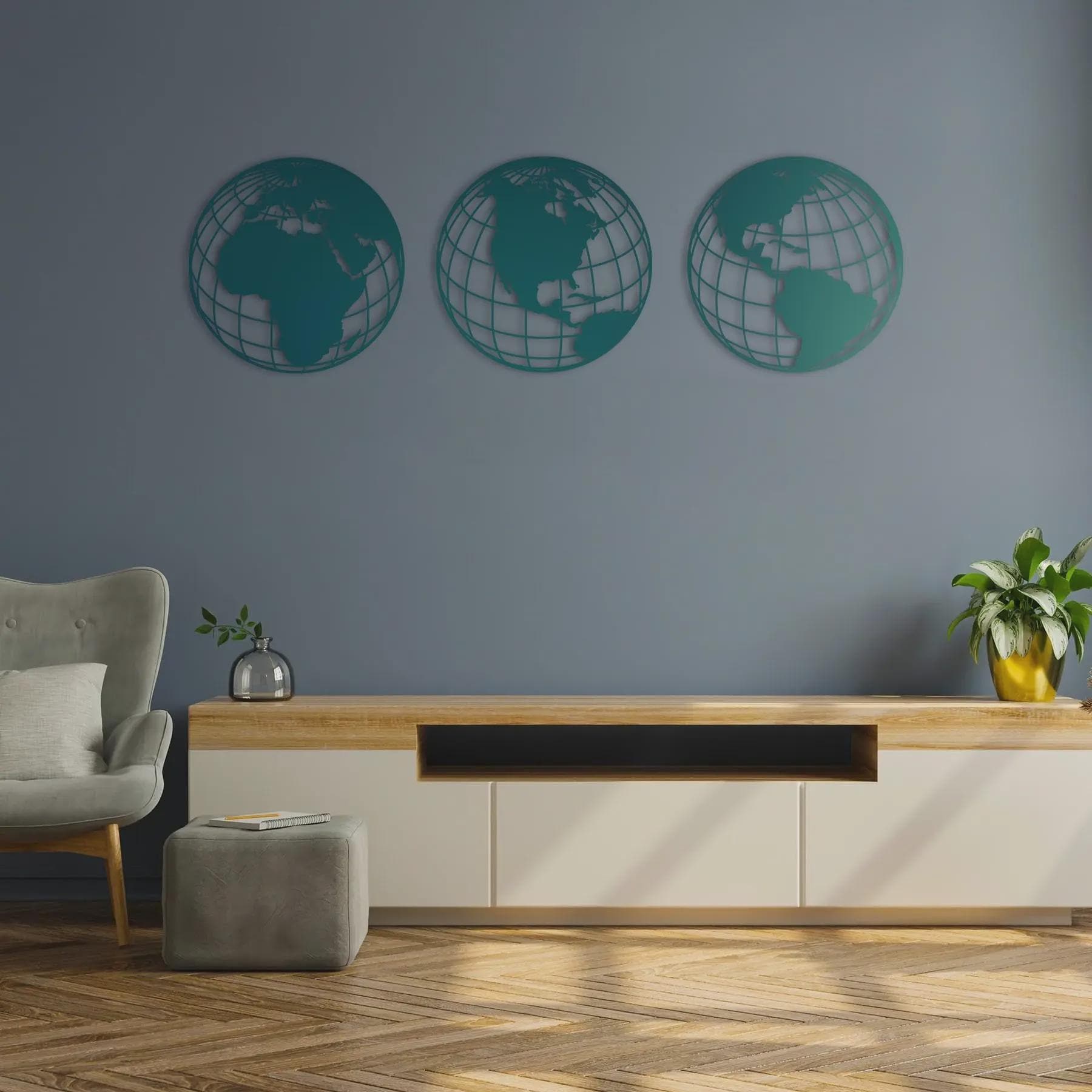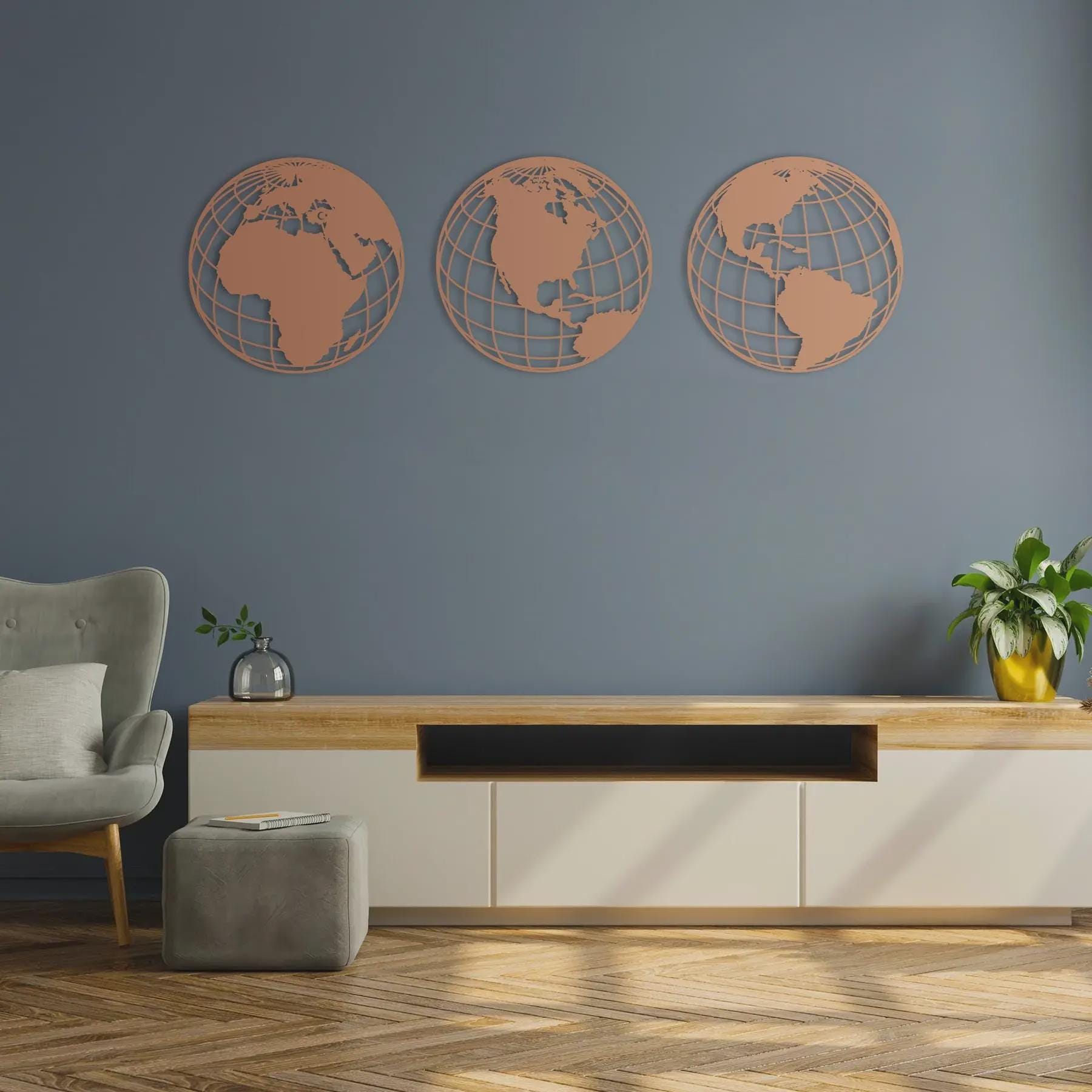 This Triple Globe World Map Metal Wall Art presents the Earth from three different perspectives, symbolizing travel, exploration, and a global mindset. Crafted from 2mm high-quality steel using precision laser cutting, it creates a stunning 3D shadow effect by standing 1.5 cm away from the wall.